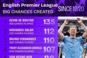 19-20赛季以来英超创造重大机会榜:德布劳内、萨拉赫、B费前三